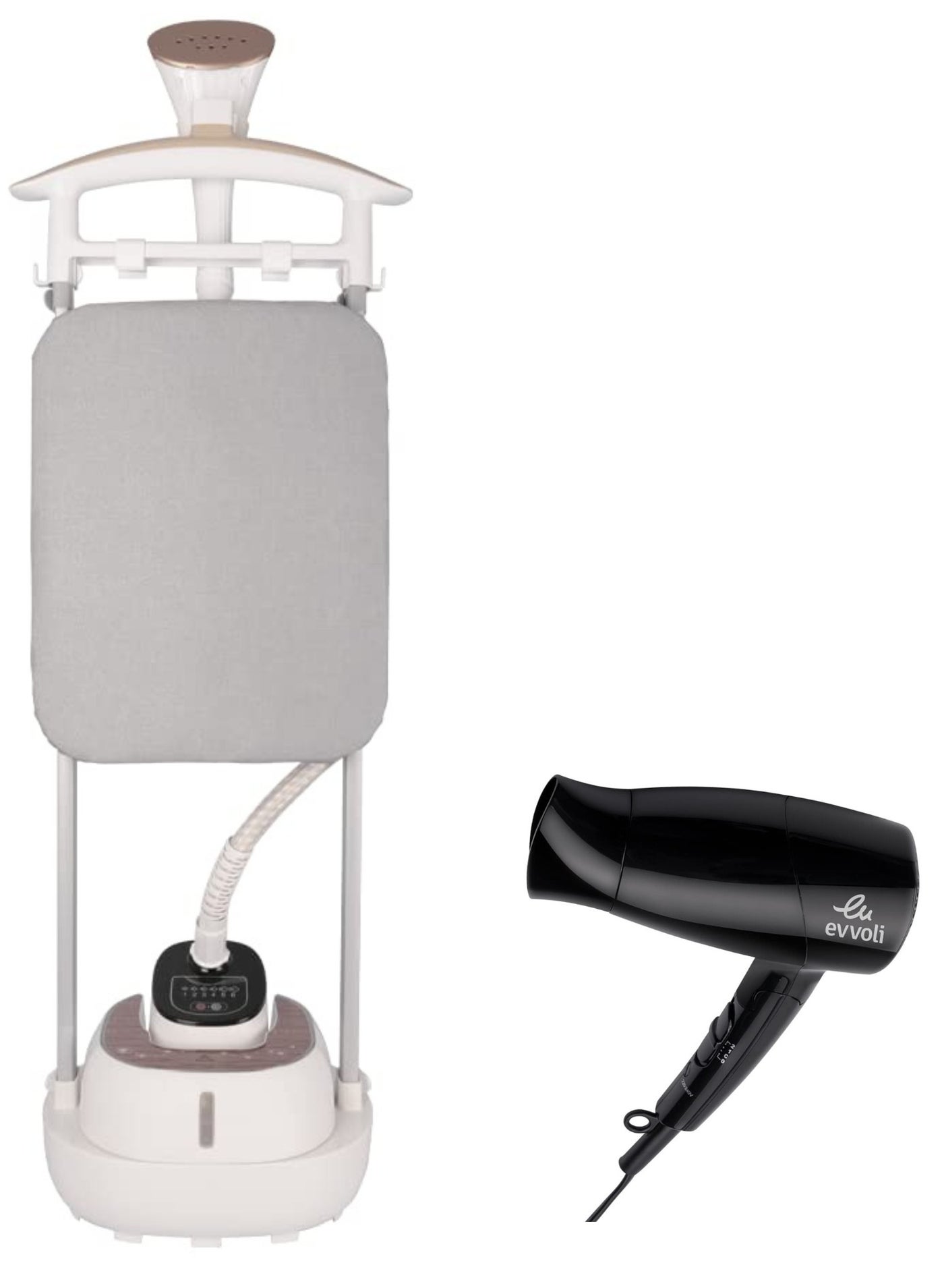Evvoli Garment Steamer 2000w Stainless Steel Soleplate And 6 Steam Level And Hair Dryer 2200w Ionic Cool Shot Bundle 2 L 2200 W Evir Gs2000g Evhc Hd2200w White